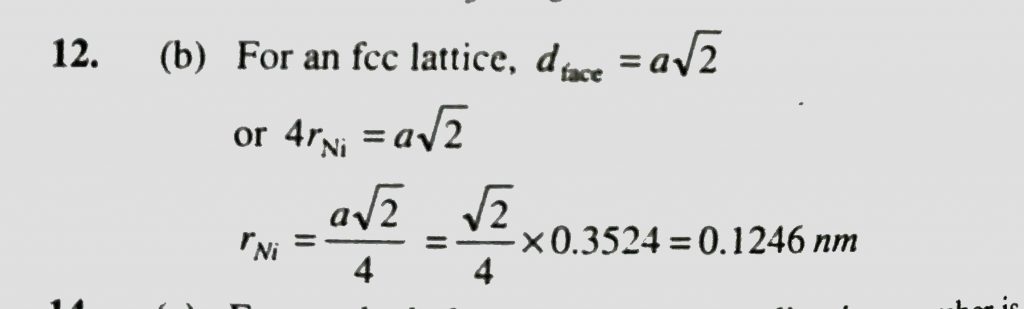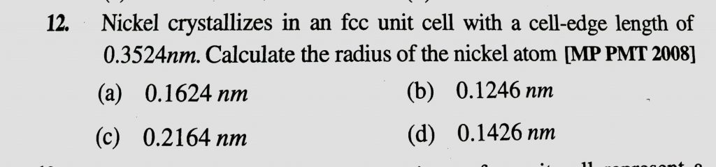 Nickel crystallizes in an fcc unit cell with a cell – edge length of 0.3524 nm. Calculate the radius of the nickel atom Nickel crystallizes in an fcc unit cell with a cell - edge length of 0.3524 nm. Calculate the radius of the nickel atom February 8, 2021 Category: Uncategorised (JEE Advanced Physics by BM Sharma + GMP Solutions) , Facebook Messenger WhatsApp Share this:TwitterFacebook Related