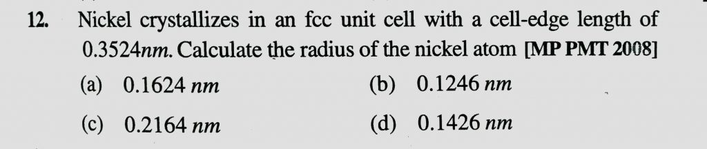 Nickel crystallizes in an fcc unit cell with – edge length of 0.3524 nm. Calculate the radius of the nickel atom Nickel crystallizes in an fcc unit cell with - edge length of 0.3524 nm. Calculate the radius of the nickel atom December 16, 2020 Category: Uncategorised (JEE Advanced Physics by BM Sharma + GMP Solutions) , Facebook Messenger WhatsApp Share this:TwitterFacebook Related