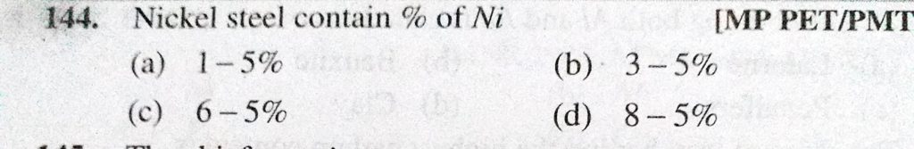 Nickel steel contain % of Ni (a) 1-5 % (b) 3 – 5 % (c) 6 – 5 % (d) 8 – 5 % Nickel steel contain % of Ni (a) 1-5 % (b) 3 - 5 % (c) 6 - 5 % (d) 8 - 5 % December 1, 2020 Category: Uncategorised (JEE Advanced Physics by BM Sharma + GMP Solutions) , Facebook Messenger WhatsApp Share this:TwitterFacebook Related