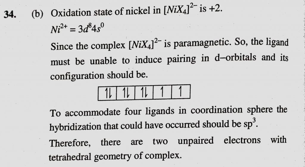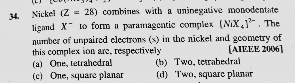 Nickel (Z = 28) combines with a uninegative monodentate ligand X- to form a paramagnetic complex (NiX4) 2- . The number of unpaired electrons(s) in the nickel and geometry of this complex Nickel (Z = 28) combines with a uninegative monodentate ligand X- to form a paramagnetic complex (NiX4) 2- . The number of unpaired electrons(s) in the nickel and geometry of this complex December 4, 2020 Category: Uncategorised (JEE Advanced Physics by BM Sharma + GMP Solutions) , Facebook Messenger WhatsApp Share this:TwitterFacebook Related