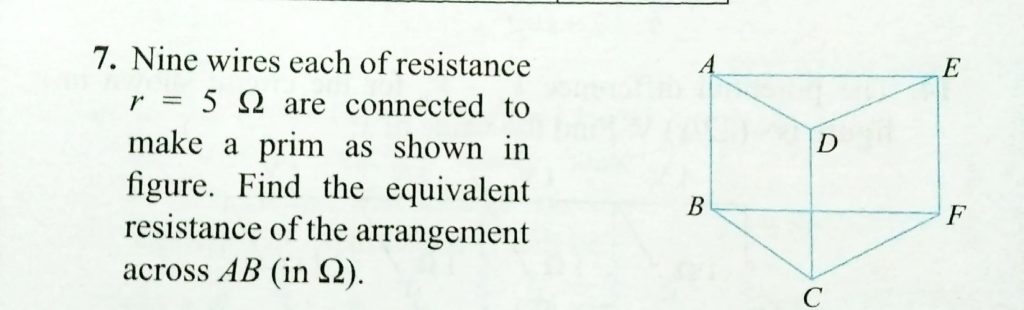 Nine wires each of resistance are connected to make a prism as shown in figure. Find the equivalent resistance of the arrangement across AB (in ohm ) Nine wires each of resistance are connected to make a prism as shown in figure. Find the equivalent resistance of the arrangement across AB (in ohm ) November 12, 2020 Category: Uncategorised (JEE Advanced Physics by BM Sharma + GMP Solutions) , Facebook Messenger WhatsApp Share this:TwitterFacebook Related