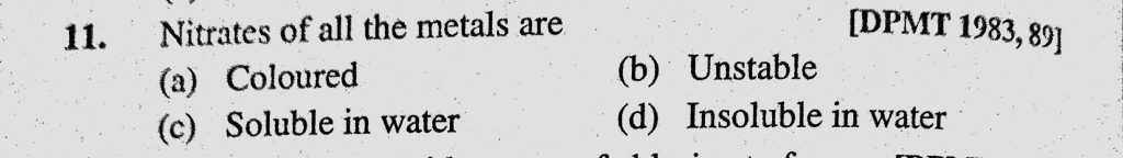Nitrates of all the metals are (a) Coloured (b) Unstable (c) Soluble in water (d) Insoluble in water Nitrates of all the metals are (a) Coloured (b) Unstable (c) Soluble in water (d) Insoluble in water December 6, 2020 Category: Uncategorised (JEE Advanced Physics by BM Sharma + GMP Solutions) , Facebook Messenger WhatsApp Share this:TwitterFacebook Related