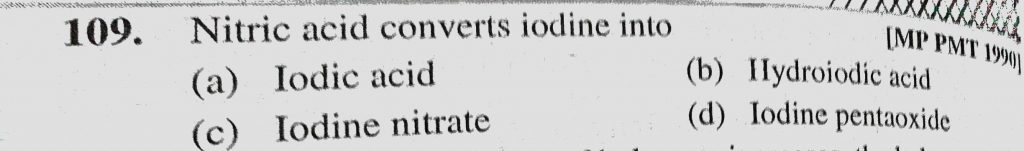 Nitric acid converts iodine into (a) Iodic acid (b) Hydroiodic acid (c) Iodine nitrate (d) Iodine pentaoxide Nitric acid converts iodine into (a) Iodic acid (b) Hydroiodic acid (c) Iodine nitrate (d) Iodine pentaoxide November 24, 2020 Category: Uncategorised (JEE Advanced Physics by BM Sharma + GMP Solutions) , Facebook Messenger WhatsApp Share this:TwitterFacebook Related