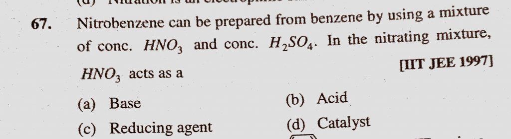 Nitrobenzene can be prepared from benzene by using a mixture of conc. HNO3 and conc. H2SO4. In the nitrating mixture, HNO3 acts as a HNO3 acts as a Nitrobenzene can be prepared from benzene by using a mixture of conc. HNO3 and conc. H2SO4. In the nitrating mixture December 16, 2020 Category: Uncategorised (JEE Advanced Physics by BM Sharma + GMP Solutions) , Facebook Messenger WhatsApp Share this:TwitterFacebook Related