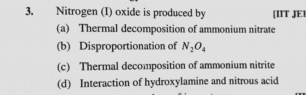 Nitrogen (I) oxide is produced by (a) Thermal decomposition of ammonium nitrate (b) Disproportionation of N2O4 Nitrogen (I) oxide is produced by (a) Thermal decomposition of ammonium nitrate (b) Disproportionation of N2O4 November 28, 2020 Category: Uncategorised (JEE Advanced Physics by BM Sharma + GMP Solutions) , Facebook Messenger WhatsApp Share this:TwitterFacebook Related