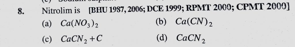 Nitrolim is (a) Ca(NO3)2 (b) Ca(CN)2 (c) CaCN2 + C (d) CaCN2 Nitrolim is (a) Ca(NO3)2 (b) Ca(CN)2 (c) CaCN2 + C (d) CaCN2 November 25, 2020 Category: Uncategorised (JEE Advanced Physics by BM Sharma + GMP Solutions) , Facebook Messenger WhatsApp Share this:TwitterFacebook Related