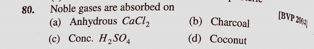 Noble gases are absorbed on (a) Anhydrous CaCl2 (b) Charcoal (c) Conc. H2SO4 (d) Coconut Noble gases are absorbed on (a) Anhydrous CaCl2 (b) Charcoal (c) Conc. H2SO4 (d) Coconut November 18, 2020 Category: Uncategorised (JEE Advanced Physics by BM Sharma + GMP Solutions) , Facebook Messenger WhatsApp Share this:TwitterFacebook Related