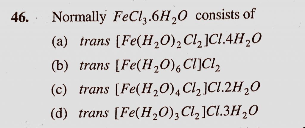 Normally FeCl3.6H2O consists of (a) trans (Fe(H2O))2Cl2)Cl.4H2) (b) trans (Fe(H2O)6Cl)Cl2 Normally FeCl3.6H2O consists of (a) trans (Fe(H2))2Cl2)Cl.4H2) (b) trans (Fe(H2O)6Cl)Cl2 December 4, 2020 Category: Uncategorised (JEE Advanced Physics by BM Sharma + GMP Solutions) , Facebook Messenger WhatsApp Share this:TwitterFacebook Related
