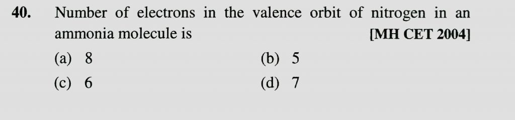 Number of electrons in the valence orbit of nitrogen in an ammonia molecule is (a) 8 (b) 5 (C) 6 (d) 7 Number of electrons in the valence orbit of nitrogen in an ammonia molecule is (a) 8 (b) 5 (C) 6 (d) 7 December 1, 2020 Category: Uncategorised (JEE Advanced Physics by BM Sharma + GMP Solutions) , Facebook Messenger WhatsApp Share this:TwitterFacebook Related