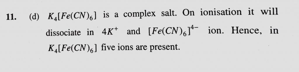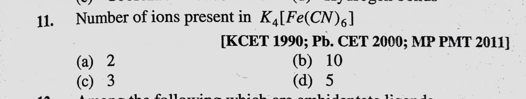 Number of ions present in K4(Fe(CN)6) (a) 2 (b) 10 (c) 3 (d) 5 Number of ions present in K4(Fe(CN)6) (a) 2 (b) 10 (c) 3 (d) 5 December 3, 2020 Category: Uncategorised (JEE Advanced Physics by BM Sharma + GMP Solutions) , Facebook Messenger WhatsApp Share this:TwitterFacebook Related