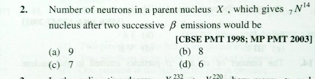 Number of neutrons in a parent nucleus X , which gives 7N^14 nucleus after two successive bita emission would be (a)) 9 (b) 8 (c) 7 (d) 6 Number of neutrons in a parent nucleus X which gives 7N^14 nucleus after two successive bita emission would be (a)) 9 (b) 8 (c) 7 (d) 6 February 14, 2021 Category: Uncategorised (JEE Advanced Physics by BM Sharma + GMP Solutions) , Facebook Messenger WhatsApp Share this:TwitterFacebook Related