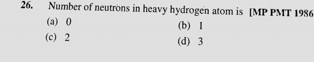 Number of neutrons in heavy hydrogen atom is (a) 0 (b) 1 (c) 2 (d) 3 Number of neutrons in heavy hydrogen atom is (a) 0 (b) 1 (c) 2 (d) 3 November 26, 2020 Category: Uncategorised (JEE Advanced Physics by BM Sharma + GMP Solutions) , Facebook Messenger WhatsApp Share this:TwitterFacebook Related