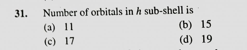 Number of orbitals in h sub – shell is (a) 11 (b) 15 (c) 17 (d) 19 Number of orbitals in h sub - shell is (a) 11 (b) 15 (c) 17 (d) 19 November 28, 2020 Category: Uncategorised (JEE Advanced Physics by BM Sharma + GMP Solutions) , Facebook Messenger WhatsApp Share this:TwitterFacebook Related