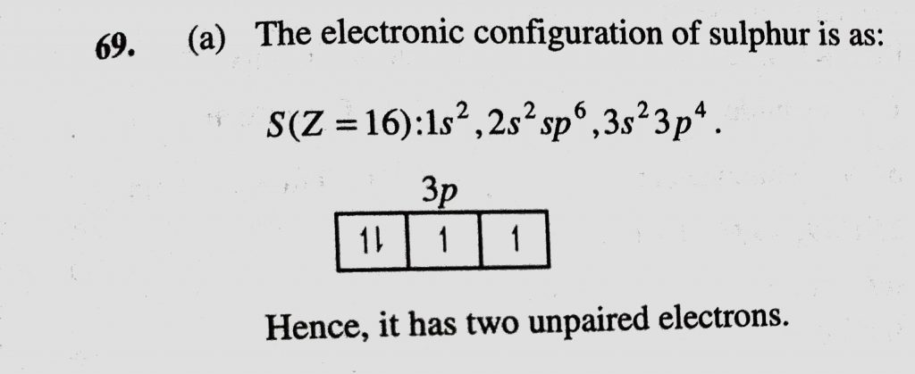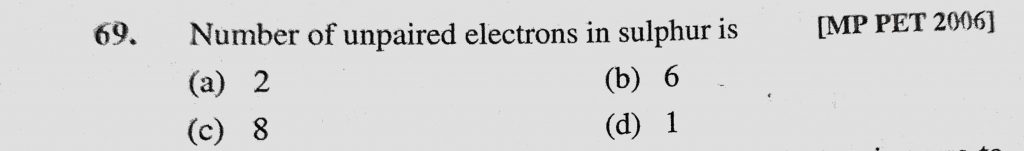 Number of unpaired electrons in sulphur is (a) 2 (b) 6 (c) 8 (d) 1 Number of unpaired electrons in sulphur is (a) 2 (b) 6 (c) 8 (d) 1 November 23, 2020 Category: Uncategorised (JEE Advanced Physics by BM Sharma + GMP Solutions) , Facebook Messenger WhatsApp Share this:TwitterFacebook Related