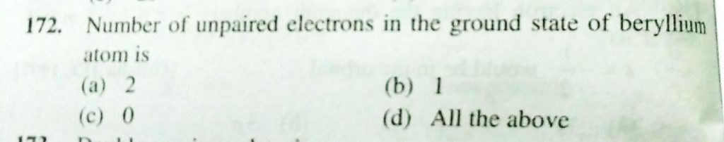 Number of unpaired electrons in the ground state of beryllium atom is (a) 2 (b) 1 (c) 0 (d) all the above Number of unpaired electrons in the ground state of beryllium atom is (a) 2 (b) 1 (c) 0 (d) all the above November 29, 2020 Category: Uncategorised (JEE Advanced Physics by BM Sharma + GMP Solutions) , Facebook Messenger WhatsApp Share this:TwitterFacebook Related