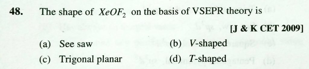 The shape of XeOF2 on teh basis of VSEPR theory is (a) see saw (b) V – shaped (c) TRigonal planar (d) T – shaped The shape of XeOF2 on teh basis of VSEPR theory is (a) see saw (b) V - shaped (c) TRigonal planar (d) T - shaped December 7, 2020 Category: Uncategorised (JEE Advanced Physics by BM Sharma + GMP Solutions) , Facebook Messenger WhatsApp Share this:TwitterFacebook Related