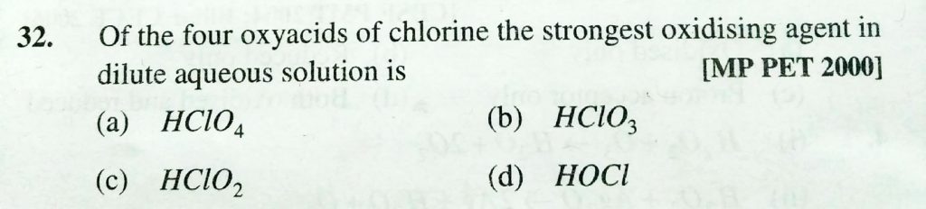 Of the four oxyacids of chlorine the strongest oxidising agent in dilute aqueous solution is Of the four oxyacids of chlorine the strongest oxidising agent in dilute aqueous solution is November 23, 2020 Category: Uncategorised (JEE Advanced Physics by BM Sharma + GMP Solutions) , Facebook Messenger WhatsApp Share this:TwitterFacebook Related