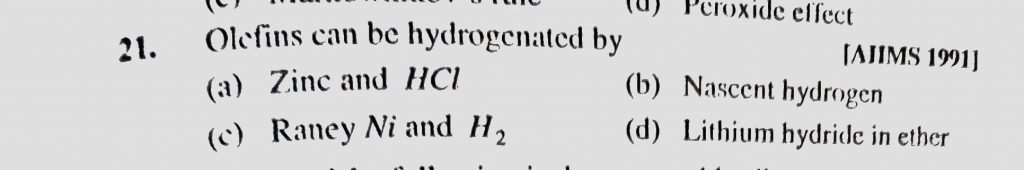 Olefins can be hydrogenated by (a) Zinc and HCl (b) Nascent hydrogen (c) Raney Ni and H2 (d) Lithium hydride in ether Olefins can be hydrogenated by (a) Zinc and HCl (b) Nascent hydrogen (c) Raney Ni and H2 (d) Lithium hydride in ether December 13, 2020 Category: Uncategorised (JEE Advanced Physics by BM Sharma + GMP Solutions) , Facebook Messenger WhatsApp Share this:TwitterFacebook Related