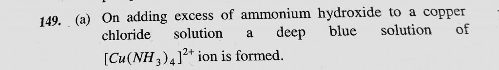 On adding excess of ammonium hydroxide to a copper chloride solution (a) A beep blue solution is obtained (b) No change is observed On adding excess of ammonium hydroxide to a copper chloride solution (a) A beep blue solution is obtained (b) No change is observed November 23, 2020 Category: Uncategorised (JEE Advanced Physics by BM Sharma + GMP Solutions) , Facebook Messenger WhatsApp Share this:TwitterFacebook Related