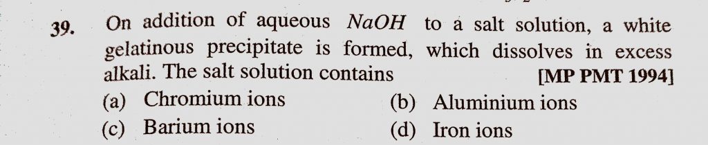 On addition of aqueous NaOH to a salt solution, a white gelatinous precipitate is formed, which dissolves in excess alkali. The salt solution contains a white gelatinous precipitate is formed On addition of aqueous NaOH to a salt solution which dissolves in excess alkali. The salt solution contains December 6, 2020 Category: Uncategorised (JEE Advanced Physics by BM Sharma + GMP Solutions) , Facebook Messenger WhatsApp Share this:TwitterFacebook Related