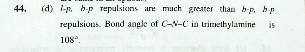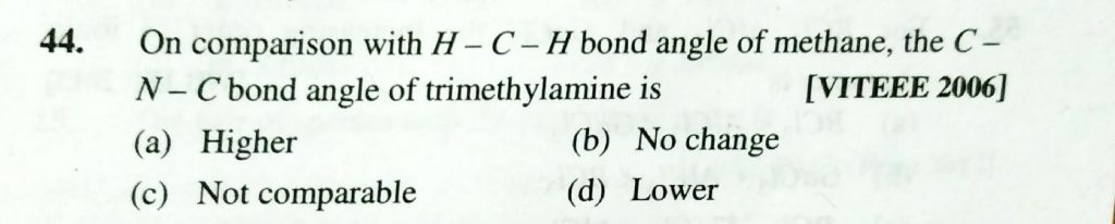 On comparison with H – C – H bond angle of methane , the N – C bond angle of trimethylamine is (a) Higher (b) no change (c) Not comparable (d) lower On comparison with H - C - H bond angle of methane the N - C bond angle of trimethylamine is (a) Higher (b) no change (c) Not comparable (d) lower December 7, 2020 Category: Uncategorised (JEE Advanced Physics by BM Sharma + GMP Solutions) , Facebook Messenger WhatsApp Share this:TwitterFacebook Related