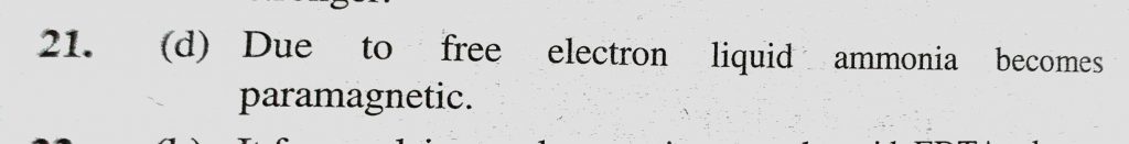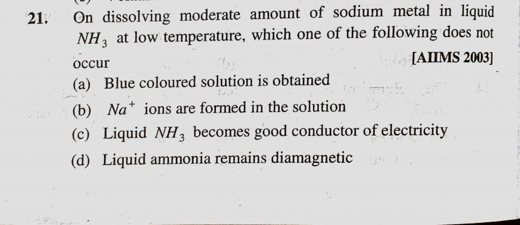 On dissolving moderate amount of sodium metal in liquid NH3 at low temperature, which one of the following does not occur (a) Blue coloured solution is obtained On dissolving moderate amount of sodium metal in liquid NH3 at low temperature which one of the following does not occur (a) Blue coloured solution is obtained November 13, 2020 Category: Uncategorised (JEE Advanced Physics by BM Sharma + GMP Solutions) , Facebook Messenger WhatsApp Share this:TwitterFacebook Related