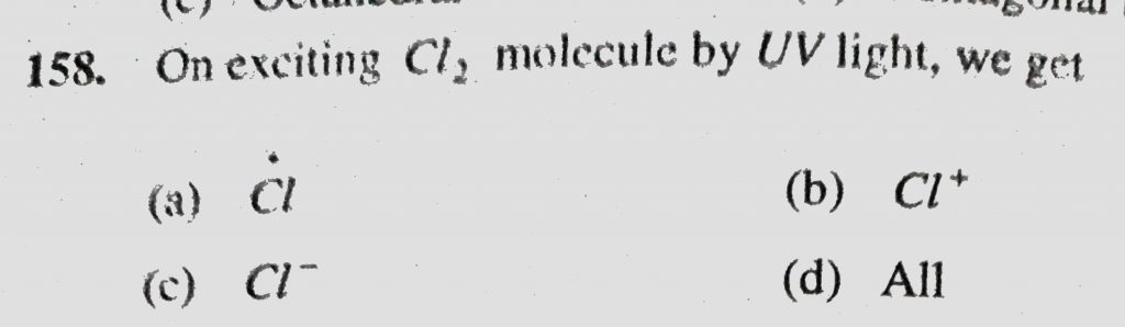 On exciting Cl2 molecule by UV light, we get (a) Cl (b) Cl+ (c) Cl- (d) All On exciting Cl2 molecule by UV light we get (a) Cl (b) Cl+ (c) Cl- (d) All November 25, 2020 Category: Uncategorised (JEE Advanced Physics by BM Sharma + GMP Solutions) , Facebook Messenger WhatsApp Share this:TwitterFacebook Related