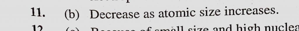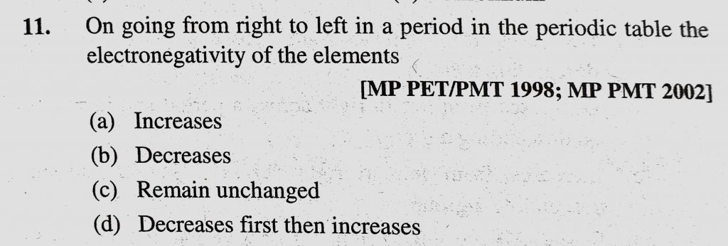 On going from right to left in a period in the periodic table the electronegativity of the elements (a) Increases (b) Decreases (c) Remain unchanged On going from right to left in a period in the periodic table the electronegativity of the elements (a) Increases (b) Decreases (c) Remain unchanged November 10, 2020 Category: Uncategorised (JEE Advanced Physics by BM Sharma + GMP Solutions) , Facebook Messenger WhatsApp Share this:TwitterFacebook Related