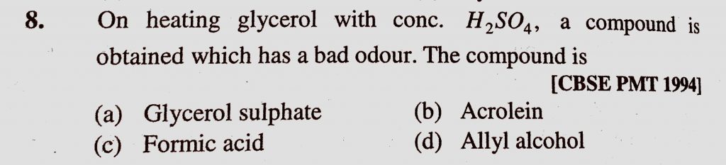 On heating glycerol with conc. H2SO4, a compound is obtained which has a bad odour. The compound is (a) Glycerol sulphate (b) Acrolein (c) Formic acid a compound is obtained which has a bad odour. The compound is (a) Glycerol sulphate (b) Acrolein (c) Formic acid On heating glycerol with conc. H2SO4 February 10, 2021 Category: Uncategorised (JEE Advanced Physics by BM Sharma + GMP Solutions) , Facebook Messenger WhatsApp Share this:TwitterFacebook Related