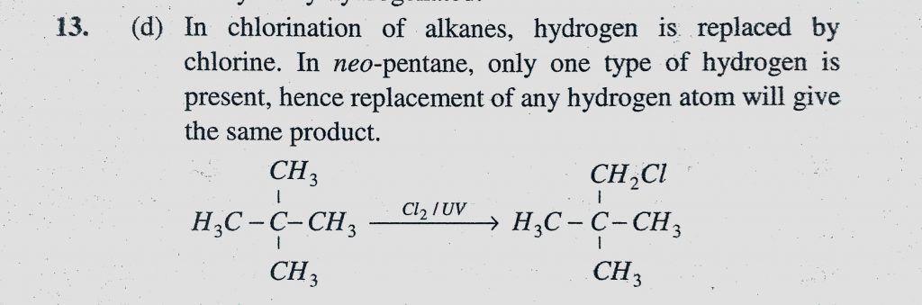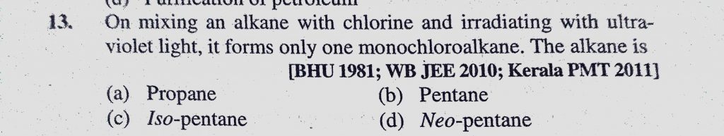 On mixing an alkane with chlorine and irradiating with ultra-violet light, it forms only one monochloroalkane. The alkane is (a) Propane (b) Pentane (c) Iso-pentane it forms only one monochloroalkane. The alkane is (a) Propane (b) Pentane (c) Iso-pentane On mixing an alkane with chlorine and irradiating with ultra-violet light December 12, 2020 Category: Uncategorised (JEE Advanced Physics by BM Sharma + GMP Solutions) , Facebook Messenger WhatsApp Share this:TwitterFacebook Related