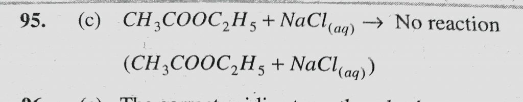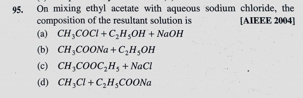 On mixing ethyl acetate with aqueous sodium chloride, the composition of the resultant solution is (a) CH3COCl + C2H5OH + NaOH (b) CH3COONa + C2H5OH On mixing ethyl acetate with aqueous sodium chloride the composition of the resultant solution is (a) CH3COCl + C2H5OH + NaOH (b) CH3COONa + C2H5OH February 13, 2021 Category: Uncategorised (JEE Advanced Physics by BM Sharma + GMP Solutions) , Facebook Messenger WhatsApp Share this:TwitterFacebook Related