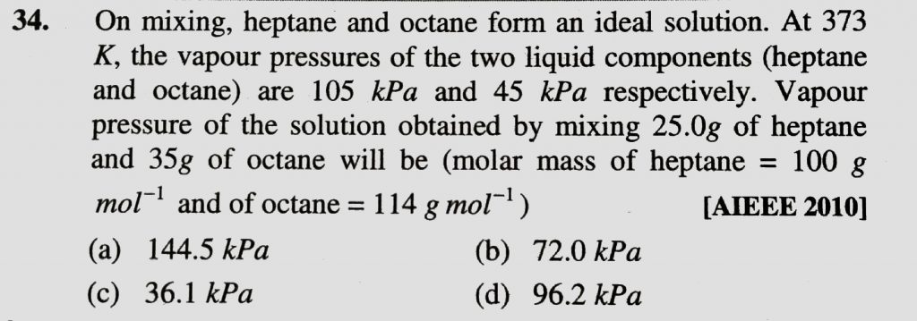 On mixing, heptane and octane form an ideal solution. At 373 K, the vapour pressure of the two liquid components (heptane and octane) are 105 kPa and 45 kPa respectively. Vapour pressure of the solution obtained by mixing 25 g of heptane and 35 g of octane will be : (molar mass of heptane = 100 g/mol^2 and of octane = 114 g /mol )