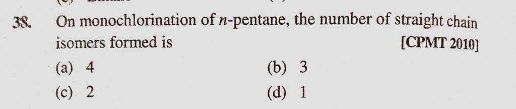 On monochlorination of n-pentane, the number of straight chain isomers formed is (a) 4 (b) 3 (c) 2 (d) 1 On monochlorination of n-pentane the number of straight chain isomers formed is (a) 4 (b) 3 (c) 2 (d) 1 December 12, 2020 Category: Uncategorised (JEE Advanced Physics by BM Sharma + GMP Solutions) , Facebook Messenger WhatsApp Share this:TwitterFacebook Related