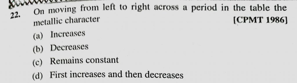 On moving from left to right across a period in the table the metallic character (a) increases (b) Decreases (c) Remains constant (d) First increases and then decreases On moving from left to right across a period in the table the metallic character (a) increases (b) Decreases (c) Remains constant (d) First increases and then decreases November 8, 2020 Category: Uncategorised (JEE Advanced Physics by BM Sharma + GMP Solutions) , Facebook Messenger WhatsApp Share this:TwitterFacebook Related