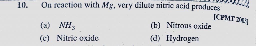 On reaction with Mg, very dilute nitric acid produces (a) NH3 (b) Nitrous oxide (c) Nitric oxide (d) Hydrogen On reaction with Mg very dilute nitric acid produces (a) NH3 (b) Nitrous oxide (c) Nitric oxide (d) Hydrogen November 12, 2020 Category: Uncategorised (JEE Advanced Physics by BM Sharma + GMP Solutions) , Facebook Messenger WhatsApp Share this:TwitterFacebook Related
