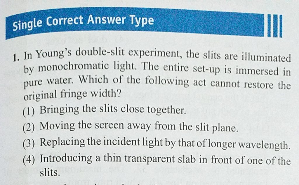 On Young’s double-slit experiment, the slits are illuminated by monochromatic light. The entire set-up is immersed in pure water. Which of the following act cannot restore the original On Young's double-slit experiment the slits are illuminated by monochromatic light. The entire set-up is immersed in pure water. Which of the following act cannot restore the original October 10, 2020 Category: Uncategorised (JEE Advanced Physics by BM Sharma + GMP Solutions) , Facebook Messenger WhatsApp Share this:TwitterFacebook Related