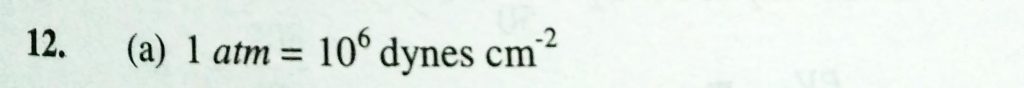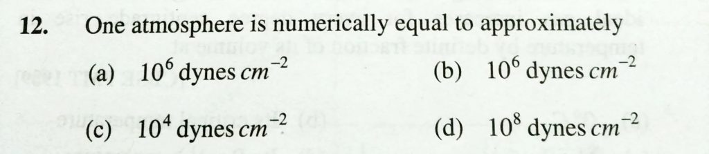 One atmosphere is numerically equal to approximately (a) 10^6 dynes/cm^2 (b) 10^6 dynes/cm^2 (c) 10^4 dynes/cm^2 (d) 10^8 dynes/cm^2 One atmosphere is numerically equal to approximately (a) 10^6 dynes/cm^2 (b) 10^6 dynes/cm^2 (c) 10^4 dynes/cm^2 (d) 10^8 dynes/cm^2 February 10, 2021 Category: Uncategorised (JEE Advanced Physics by BM Sharma + GMP Solutions) , Facebook Messenger WhatsApp Share this:TwitterFacebook Related
