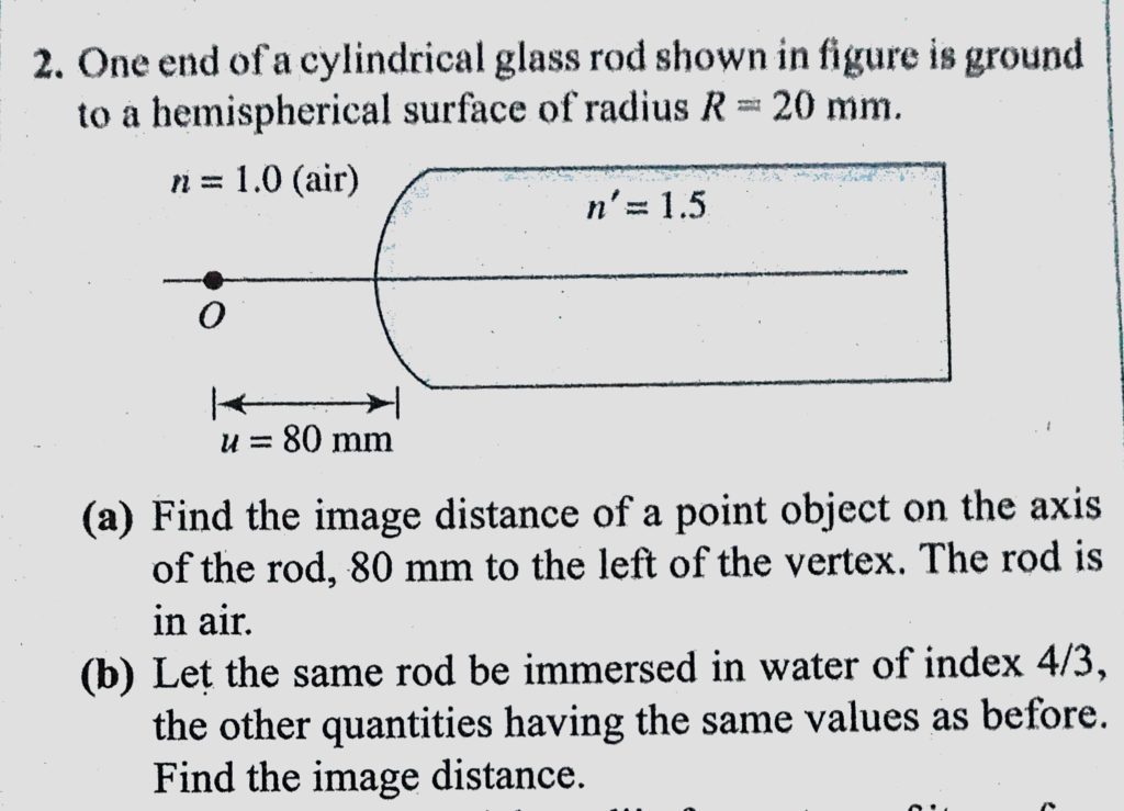 One end of a cylindrical glass rod shown in figure is ground to a hemispherical surface of radius R = 20 mm. (a) Find the image distance of a point object on the axis of the rod 80 mm One end of a cylindrical glass rod shown in figure is ground to a hemispherical surface of radius R = 20 mm. (a) Find the image distance of a point object on the axis of the rod 80 mm October 7, 2020 Category: Uncategorised (JEE Advanced Physics by BM Sharma + GMP Solutions) , Facebook Messenger WhatsApp Share this:TwitterFacebook Related