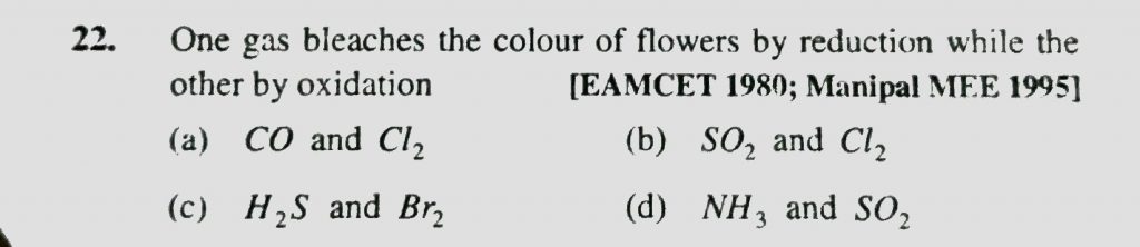 One gas bleaches the colour of flowers by reaction while the other by oxidation One gas bleaches the colour of flowers by reaction while the other by oxidation November 23, 2020 Category: Uncategorised (JEE Advanced Physics by BM Sharma + GMP Solutions) , Facebook Messenger WhatsApp Share this:TwitterFacebook Related