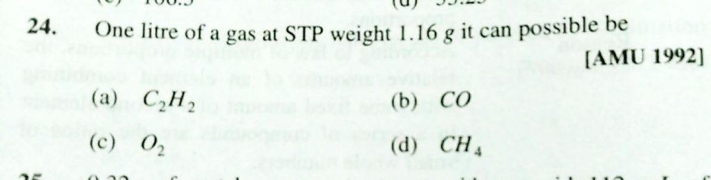 One litre of a gas at STP weight 1.16 g it can possible be (a) C2H2 (b) CO (c) O2 (d) CH4 One litre of a gas at STP weight 1.16 g it can possible be (a) C2H2 (b) CO (c) O2 (d) CH4 November 22, 2020 Category: Uncategorised (JEE Advanced Physics by BM Sharma + GMP Solutions) , Facebook Messenger WhatsApp Share this:TwitterFacebook Related