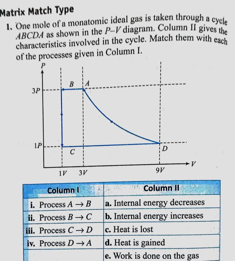 One mole of a monatomic ideal gas is taken through a cycle ABCDA as shown in the P-V diagram. Column 2 gives the characteristics involved in the cycle. Match them with each One mole of a monatomic ideal gas is taken through a cycle ABCDA as shown in the P-V diagram. Column 2 gives the characteristics involved in the cycle. Match them with each October 30, 2020 Category: Uncategorised (JEE Advanced Physics by BM Sharma + GMP Solutions) , Facebook Messenger WhatsApp Share this:TwitterFacebook Related