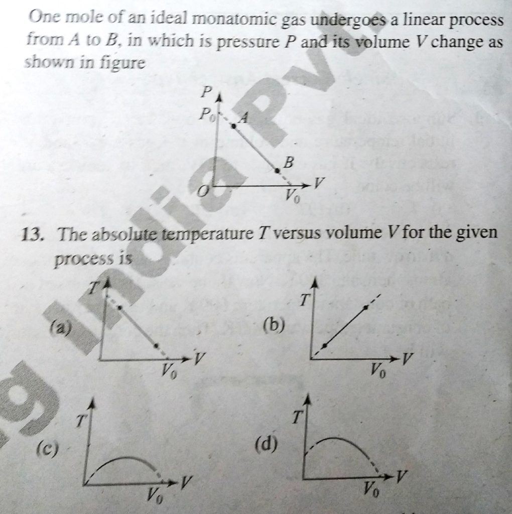 One mole of an ideal monatomic gas undergoes a linear process from A to B, in which pressure P and its volume V changes as shown in figure. The absolute temperature T versus volume V for the given process is in which pressure P and its volume V changes as shown in figure. The absolute temperature T versus volume V for the given process is One mole of an ideal monatomic gas undergoes a linear process from A to B October 5, 2020 Category: Uncategorised (JEE Advanced Physics by BM Sharma + GMP Solutions) , Facebook Messenger WhatsApp Share this:TwitterFacebook Related