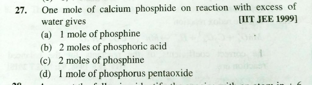 One mole of calcium phosphide on reaction with excess of water gives (a) 1 mole of phosphine (b) 2 moles of phosphoric acid (c) 2 moles of phosphine (d) 1 mole of phosphorous pentaoxide One mole of calcium phosphide on reaction with excess of water gives (a) 1 mole of phosphine (b) 2 moles of phosphoric acid (c) 2 moles of phosphine (d) 1 mole of phosphorous pentaoxide November 25, 2020 Category: Uncategorised (JEE Advanced Physics by BM Sharma + GMP Solutions) , Facebook Messenger WhatsApp Share this:TwitterFacebook Related