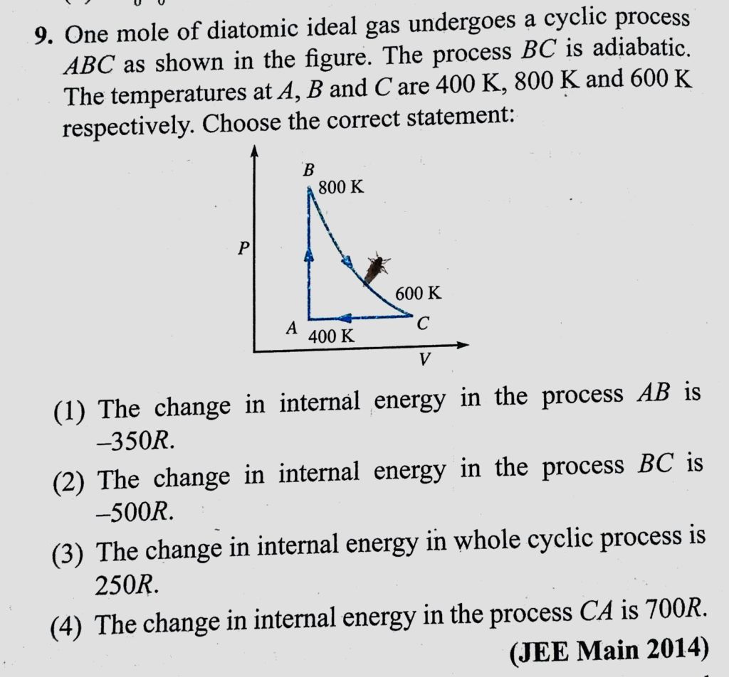 One mole of diatomic ideal gas undergoes a cyclic process ABC as shows in the figure. The process BC is adiabatic. The temperatures at A, B and C are 400 K, 800 K and 600 k respectively. 800 K and 600 k respectively. B and C are 400 K One mole of diatomic ideal gas undergoes a cyclic process ABC as shows in the figure. The process BC is adiabatic. The temperatures at A October 29, 2020 Category: Uncategorised (JEE Advanced Physics by BM Sharma + GMP Solutions) , Facebook Messenger WhatsApp Share this:TwitterFacebook Related