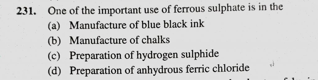 One of the important use of ferrous sulphate is in the (a) Manufacture of blue black ink (b) Manufacture of chalks One of the important use of ferrous sulphate is in the (a) Manufacture of blue black ink (b) Manufacture of chalks December 2, 2020 Category: Uncategorised (JEE Advanced Physics by BM Sharma + GMP Solutions) , Facebook Messenger WhatsApp Share this:TwitterFacebook Related