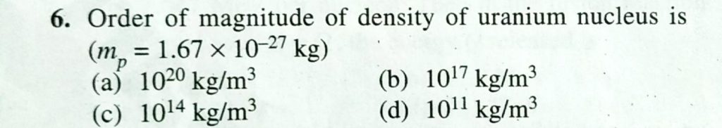 Order of magnitude of density of uranium nucleus is ( mp = 1.67 x 10^-27 kg ) Order of magnitude of density of uranium nucleus is ( mp = 1.67 x 10^-27 kg ) September 14, 2020 Category: Uncategorised (JEE Advanced Physics by BM Sharma + GMP Solutions) , Facebook Messenger WhatsApp Share this:TwitterFacebook Related