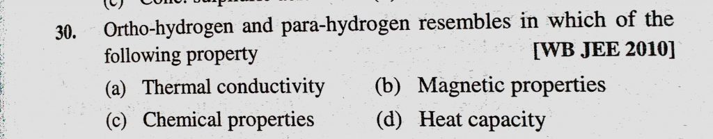 Ortho-hydrogen and para-hydrogen resembles in which of the following property (a) Thermal conductivity (b) Magnetic properties (c) Chemical properties Ortho-hydrogen and para-hydrogen resembles in which of the following property (a) Thermal conductivity (b) Magnetic properties (c) Chemical properties November 13, 2020 Category: Uncategorised (JEE Advanced Physics by BM Sharma + GMP Solutions) , Facebook Messenger WhatsApp Share this:TwitterFacebook Related