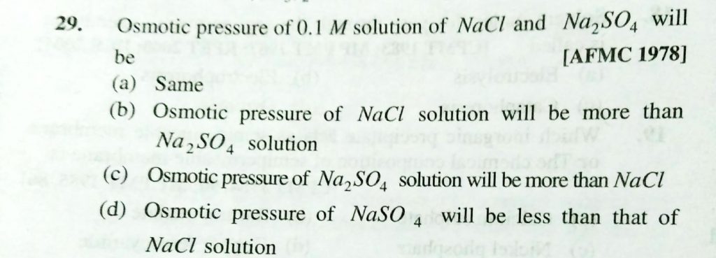 Osmotic pressure of 0.1 M solution solution NaCL and Na2SO4 will be (a) same (b) Osmotic pressure of NaCL solution will be more than Na2SO4 solution (c) Osmotic pressure of Na2SO4 solution will be more than NaCL Which of the following colligative properties can provide molar mass of proteins ( or polymers or colloids ) with greater precision December 13, 2020 Category: Uncategorised (JEE Advanced Physics by BM Sharma + GMP Solutions) , Facebook Messenger WhatsApp Share this:TwitterFacebook Related