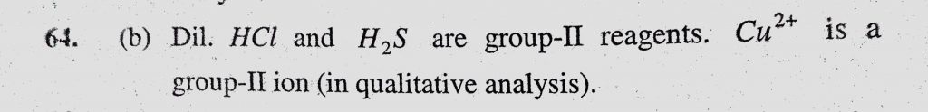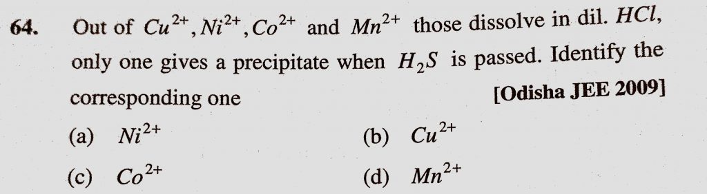 Out of Cu 2+ , Ni 2+, Co 2+ and Mn 2+ those dissolve in dil. HCl, only one gives a precipitate when H2S is passed. Identify the corresponding one Co 2+ and Mn 2+ those dissolve in dil. HCl Ni 2+ only one gives a precipitate when H2S is passed. Identify the corresponding one Out of Cu 2+ December 7, 2020 Category: Uncategorised (JEE Advanced Physics by BM Sharma + GMP Solutions) , Facebook Messenger WhatsApp Share this:TwitterFacebook Related