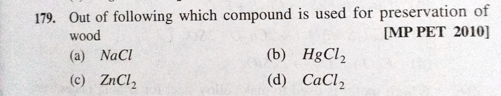 Out of following which compound is used for preservation of wood (a) NaCl (b) HgCl2 (c) ZnCl2 (d) CaCl2 Out of following which compound is used for preservation of wood (a) NaCl (b) HgCl2 (c) ZnCl2 (d) CaCl2 December 2, 2020 Category: Uncategorised (JEE Advanced Physics by BM Sharma + GMP Solutions) , Facebook Messenger WhatsApp Share this:TwitterFacebook Related